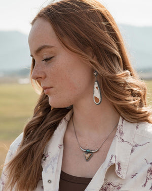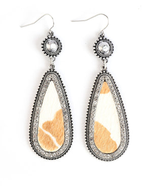 • Silver tear drop earrings with rhinestones surrounding tan and cream print genuine leather